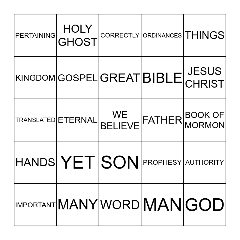 This bingo card has a free space and 24 words: YET, MANY, GREAT, IMPORTANT, THINGS, PERTAINING, KINGDOM, HOLY GHOST, FATHER, SON, BIBLE, TRANSLATED, PROPHESY, AUTHORITY, GOSPEL, MAN, BOOK OF MORMON, CORRECTLY, JESUS CHRIST, ETERNAL, GOD, HANDS, ORDINANCES and WORD.