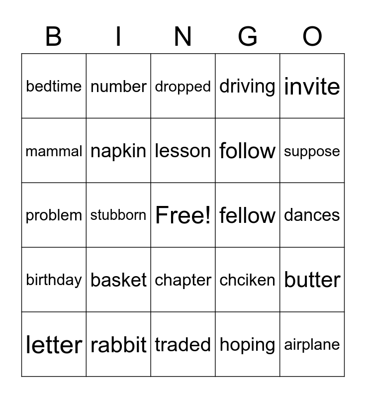 This bingo card has a free space and 24 words: basket, rabbit, lesson, letter, invite, bedtime, mammal, number, fellow, chapter, follow, problem, chciken, butter, napkin, hoping, dances, dropped, suppose, stubborn, airplane, birthday, driving and traded.