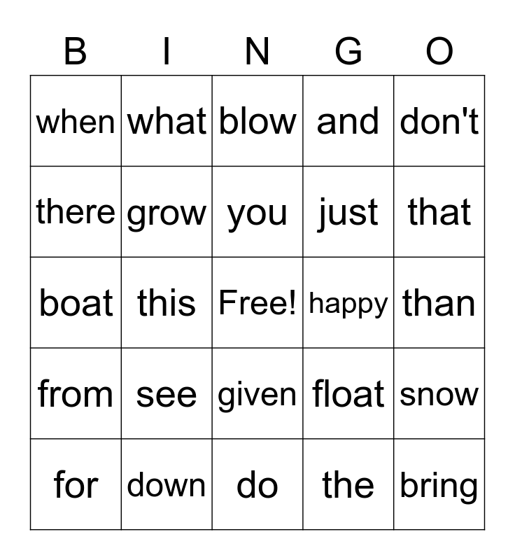 This bingo card has a free space and 25 words: see, do, you, for, don't, when, there, what, happy, given, just, boat, float, snow, grow, show, than, blow, that, this, bring, down, from, and and the.