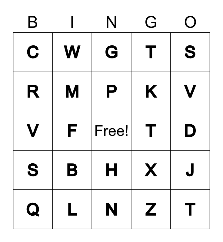 This bingo card has a free space and 24 words: B, L, P, Q, S, C, R, W, T, H, K, V, X, J, M, Z, D, G, V, F, T, S, T and N.