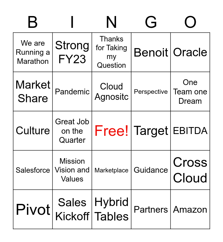 This bingo card has a free space and 29 words: Pivot, SAAS Business Model, Great Job on the Quarter, Remote, We are Running a Marathon, Thanks for Taking my Question, Pandemic, Mission Vision and Values, Target, Sales Kickoff, EBITDA, Amazon, Hybrid Tables, Partners, One Team one Dream, Strategy, Marketplace, Salesforce, Oracle, Culture, Guidance, Unprecedented, Perspective, Market Share, Benoit, Strong FY23, Cross Cloud, Cloud Agnositc and Platform.