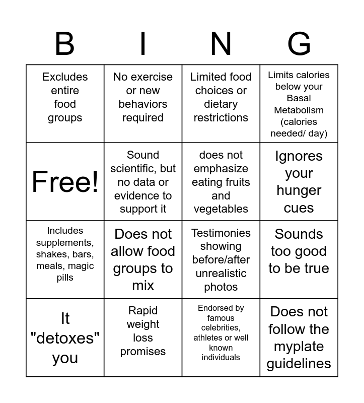 This bingo card has 16 words: Rapid weight loss promises, Sounds too good to be true, Limited food choices or dietary restrictions, Excludes entire food groups, Includes supplements, shakes, bars, meals, magic pills, No exercise or new behaviors required, Testimonies showing before/after unrealistic photos, Endorsed by famous celebrities, athletes or well known individuals, Free!, Sound scientific, but no data or evidence to support it, It "detoxes" you, Limits calories below your Basal Metabolism (calories needed/ day), Does not allow food groups to mix, Ignores your hunger cues, does not emphasize eating fruits and vegetables and Does not follow the myplate guidelines.