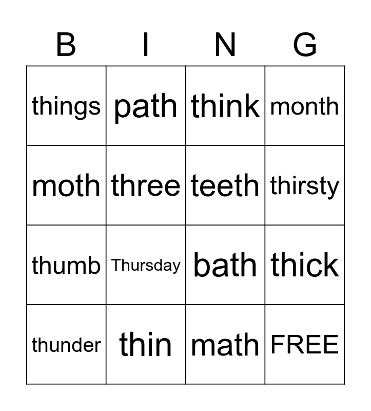 This bingo card has 16 words: thin, thick, think, things, thumb, path, bath, math, moth, three, thunder, month, Thursday, thirsty, teeth and FREE.