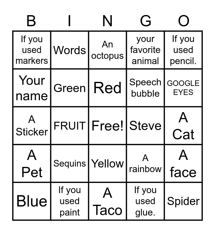 This bingo card has a free space and 24 words: Sequins, If you used paint, Red, Blue, If you used pencil., If you used markers, Your name, Words, Steve, Yellow, Speech bubble, A Sticker, A rainbow, A face, Green, If you used glue., A Cat, An octopus, GOOGLE EYES, FRUIT, Spider, A Pet, your favorite animal and A Taco.