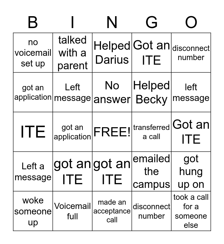 This bingo card has a free space and 24 words: got an ITE, Voicemail full, No answer, woke someone up, disconnect number, no voicemail set up, got an application, talked with a parent, transferred a call, got an ITE, Helped Becky, ITE, emailed the campus, got hung up on, Left message, disconnect number, Got an ITE, Helped Darius, left message, got an application, took a call for a someone else, Left a message, Got an ITE and made an acceptance call.
