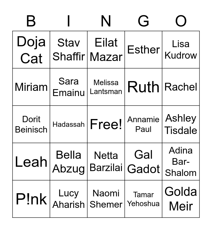 This bingo card has a free space and 39 words: Ruth Bader Ginsburg, Anne Frank, Ofra Haza, Sara Emainu, P!nk, Netta Barzilai, Melissa Lantsman, Idina Menzel, Lisa Kudrow, Leah, Hadassah, Esther, Golda Meir, Ashley Tisdale, Annamie Paul, Bella Abzug, Chava, Doja Cat, Devorah, Gal Gadot, Miriam, Naomi Shemer, Ruth, Rachel, Noa Tishby, Bar Refaeli, Leah Goldberg, Natalie Portman, Ayelet Shaked, Stav Shaffir, Ada Yonath, Yarden Gerbi, Eilat Mazar, Lucy Aharish, Tamar Yehoshua, Shari Arison, Adina Bar-Shalom, Dorit Beinisch and Bobbie Rosenfeld.