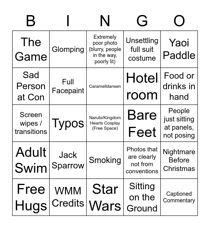 This bingo card has a free space and 24 words: Jack Sparrow, WMM Credits, Caramelldansen, Free Hugs, Yaoi Paddle, The Game, Sad Person at Con, Glomping, Bare Feet, Smoking, Hotel room, Screen wipes / transitions, Photos that are clearly not from conventions, Nightmare Before Christmas, Full Facepaint, Sitting on the Ground, People just sitting at panels, not posing, Extremely poor photo (blurry, people in the way, poorly lit), Food or drinks in hand, Typos, Captioned Commentary, Adult Swim, Unsettling full suit costume and Star Wars.