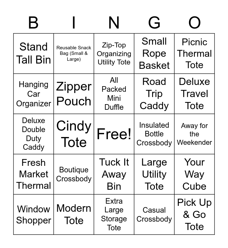This bingo card has a free space and 27 words: Large Utility Tote, Little Carry All, Road Trip Caddy, Extra Large Storage Tote, Hanging Car Organizer, Zip-Top Organizing Utility Tote, Reusable Snack Bag (Small & Large), Fresh Market Thermal, Insulated Bottle Crossbody, Your Way Cube, Deluxe Double Duty Caddy, Small Rope Basket, Window Shopper, Modern Tote, Deluxe Travel Tote, Journey Backpack, Zipper Pouch, All Packed Mini Duffle, Boutique Crossbody, Stand Tall Bin, Away for the Weekender, Casual Crossbody, Cindy Tote, Pick Up & Go Tote, Tuck It Away Bin, Picnic Thermal Tote and Everyday Essential Tote.