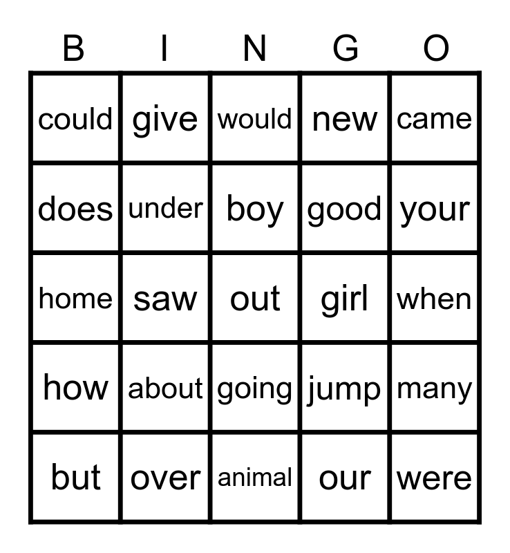 This bingo card has 25 words: about, animal, boy, but, came, could, does, give, girl, going, good, home, jump, many, under, were, when, would, your, saw, out, over, how, new and our.