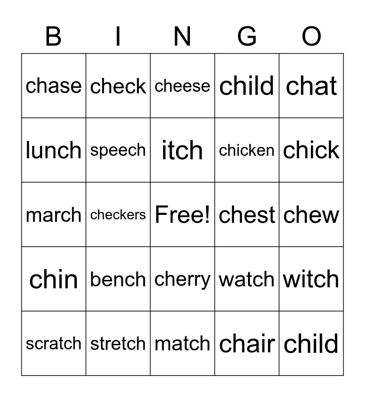This bingo card has a free space and 24 words: scratch, bench, itch, chair, chat, chase, check, cheese, chest, chew, march, speech, watch, witch, lunch, stretch, match, child, chick, chin, checkers, cherry, chicken and child.