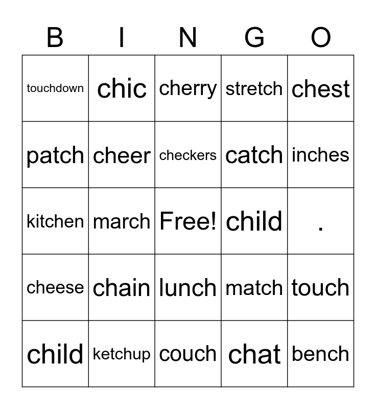 This bingo card has a free space and 34 words: chair, chat, chase, check, cheese, cheer, chest, child, chic, chin, checkers, cherry, beach, catcher, child, inches, ketchup, kitchen, chain, match, lunch, march, touchdown, ., couch, bench, stretch, pitch, catch, patch, reach, march, touch and speech.