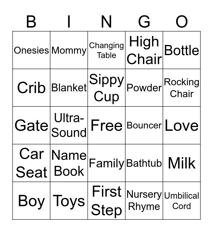This bingo card has a free space and 24 words: Name Book, Toys, Sippy Cup, Boy, Bottle, Onesies, Crib, Mommy, Bouncer, Family, Powder, Gate, Bathtub, Milk, Blanket, Nursery Rhyme, Love, Changing Table, Rocking Chair, Ultra-Sound, Umbilical Cord, Car Seat, High Chair and First Step.