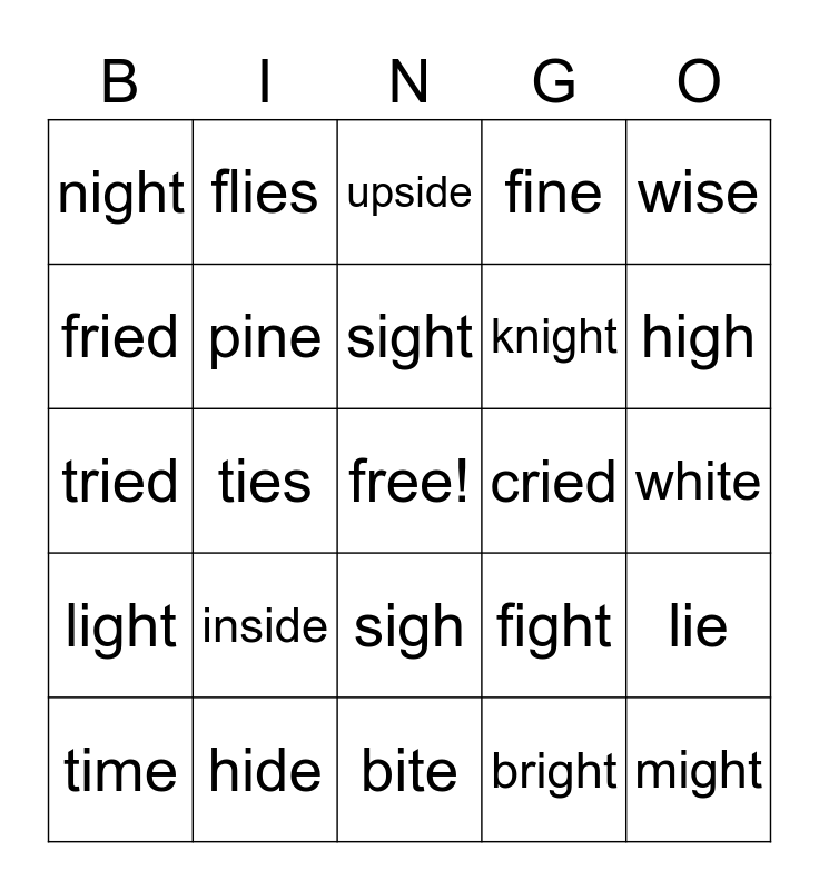 This bingo card has a free space and 24 words: inside, hide, sight, time, wise, night, fried, flies, cried, sigh, knight, tried, fight, lie, pine, bright, white, upside, high, ties, might, light, fine and bite.