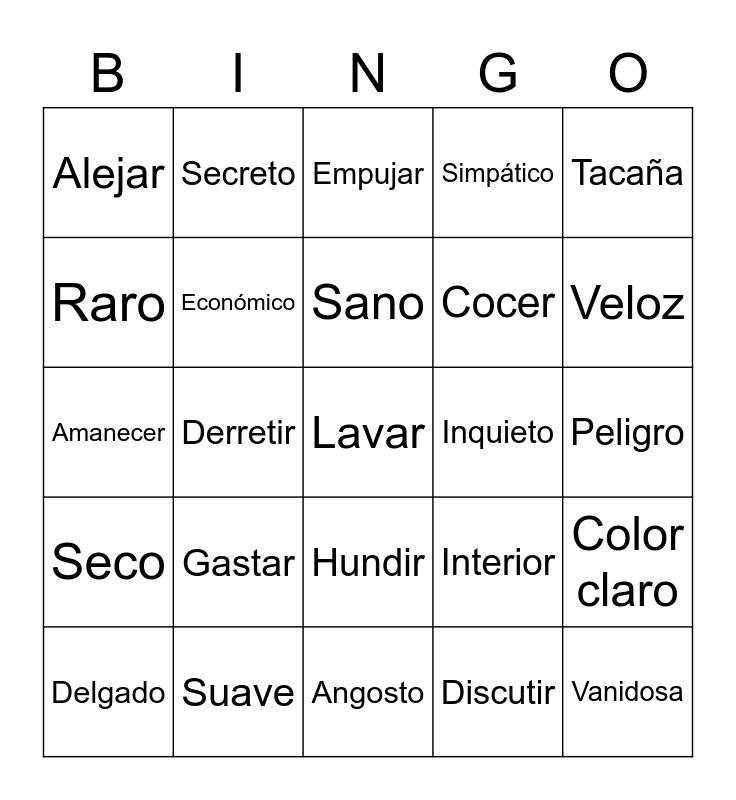 This bingo card has a free space and 24 words: Gastar, Suave, Sano, Delgado, Tacaña, Alejar, Raro, Secreto, Inquieto, Hundir, Cocer, Amanecer, Interior, Color claro, Económico, Discutir, Peligro, Empujar, Veloz, Derretir, Vanidosa, Seco, Simpático and Angosto.