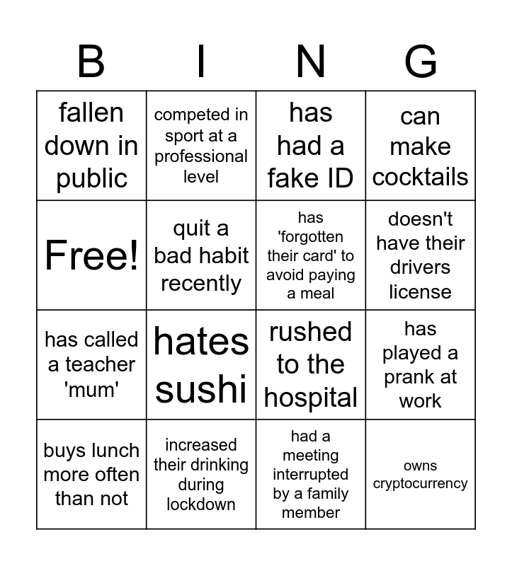 This bingo card has 16 words: increased their drinking during lockdown, has played a prank at work, has had a fake ID, fallen down in public, has called a teacher 'mum', competed in sport at a professional level, rushed to the hospital, had a meeting interrupted by a family member, Free!, quit a bad habit recently, buys lunch more often than not, can make cocktails, hates sushi, doesn't have their drivers license, has 'forgotten their card' to avoid paying a meal and owns cryptocurrency.