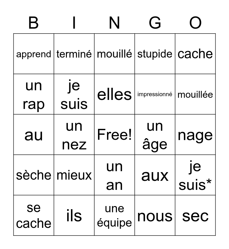 This bingo card has a free space and 24 words: mieux, ils, elles, se cache, cache, apprend, un rap, terminé, un âge, un an, impressionné, au, aux, je suis*, je suis, nous, nage, mouillé, mouillée, un nez, sec, sèche, stupide and une équipe.