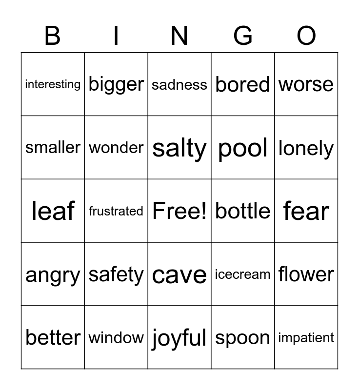This bingo card has a free space and 24 words: safety, window, salty, better, worse, interesting, smaller, bigger, bottle, cave, pool, leaf, icecream, flower, wonder, spoon, fear, sadness, lonely, frustrated, impatient, angry, bored and joyful.