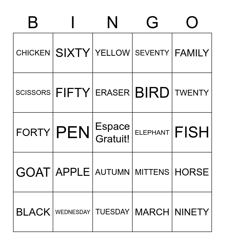 This bingo card has a free space and 74 words: RED, ORANGE, YELLOW, BLUE, GREEN, PURPLE, PINK, GRAY, BLACK, WHITE, BROWN, PENCIL, ERASER, SCISSORS, BINDER, PEN, TEN, TWENTY, THIRTY, FORTY, FIFTY, SIXTY, SEVENTY, EIGHTY, NINETY, ONE HUNDRED, FRENCH, ENGLISH, MOM, DAD, FAMILY, BROTHER, SISTER, JANUARY, FEBRUARY, MARCH, APRIL, MAY, JUNE, MONDAY, TUESDAY, WEDNESDAY, THURSDAY, FRIDAY, CHEESE, CHICKEN, BANANA, APPLE, MILK, WATER, PICKLE, EGG, FISH, WINTER, SPRING, SUMMER, AUTUMN, DOG, CAT, HORSE, BIRD, COW, GOAT, BEAVER, ELEPHANT, MONKEY, TURTLE, SNOW, MITTENS, DOG SLED, SNOWMOBILE, ICE FISHING, SUGAR SHACK and FIRE WORKS.