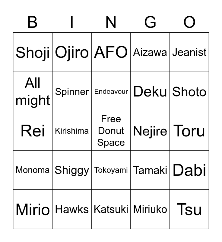 This bingo card has a free space and 24 words: Shiggy, Hawks, Endeavour, Mirio, Jeanist, Shoji, All might, Ojiro, Nejire, Tokoyami, Deku, Rei, Tamaki, Dabi, Spinner, Miriuko, Toru, AFO, Shoto, Kirishima, Tsu, Monoma, Aizawa and Katsuki.
