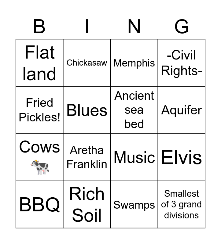 This bingo card has 16 words: Rich Soil, Elvis, Memphis, Flat land, Cows🐄, Chickasaw, Music, Swamps, Fried Pickles!, Blues, BBQ, -Civil Rights-, Aretha Franklin, Aquifer, Ancient sea bed and Smallest of 3 grand divisions.