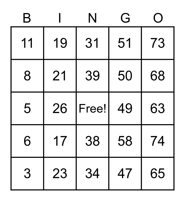 This bingo card has a free space and 73 words: 1, 16, 31, 46, 61, 2, 17, 32, 47, 62, 3, 18, 49, 63, 4, 19, 33, 50, 64, 5, 21, 34, 51, 65, 6, 22, 35, 52, 66, 7, 23, 36, 53, 67, 8, 24, 37, 54, 68, 9, 25, 38, 55, 69, 10, 26, 39, 56, 70, 11, 27, 40, 57, 71, 12, 28, 41, 58, 72, 13, 29, 42, 59, 73, 14, 30, 43, 60, 74, 15, 44, 75 and 45.