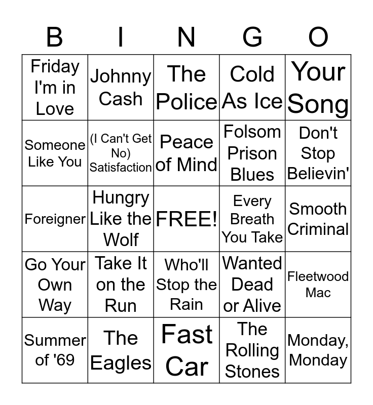 This bingo card has a free space and 39 words: Listen to the Music, Here Comes the Sun, (Don't Fear) the Reaper, (I Can't Get No) Satisfaction, Summer of '69, Who'll Stop the Rain, Peace of Mind, Slide, Your Song, Go Your Own Way, Hungry Like the Wolf, Cold As Ice, Monday, Monday, Smooth Criminal, Every Breath You Take, Take It on the Run, Peaceful Easy Feelin', Friday I'm in Love, Carry On My Wayward Son, Wanted Dead or Alive, Someone Like You, Fast Car, Folsom Prison Blues, Don't Stop Believin', Adele, The Beatles, Boston, Bon Jovi, The Cure, Johnny Cash, Journey, Michael Jackson, The Police, The Eagles, The Rolling Stones, Elton John, Fleetwood Mac, Foreigner and Duran Duran.