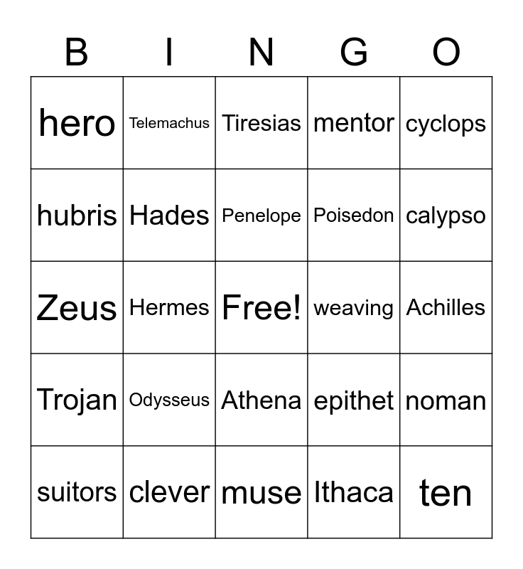 This bingo card has a free space and 24 words: Odysseus, clever, Penelope, suitors, cyclops, hero, hubris, Telemachus, weaving, Athena, Poisedon, Zeus, epithet, noman, Hades, Ithaca, Achilles, Tiresias, calypso, Hermes, ten, Trojan, mentor and muse.
