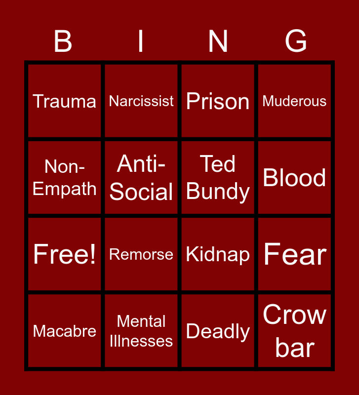 This bingo card has 20 words: Fear, Impulsive, Prison, Victim, Macabre, Non- Empath, Mental Illnesses, Trauma, Free!, Narcissist, Remorse, Kidnap, Anti-Social, Crow bar, Ted Bundy, Manipulative, Blood, Muderous, Deadly and Toxic Love.