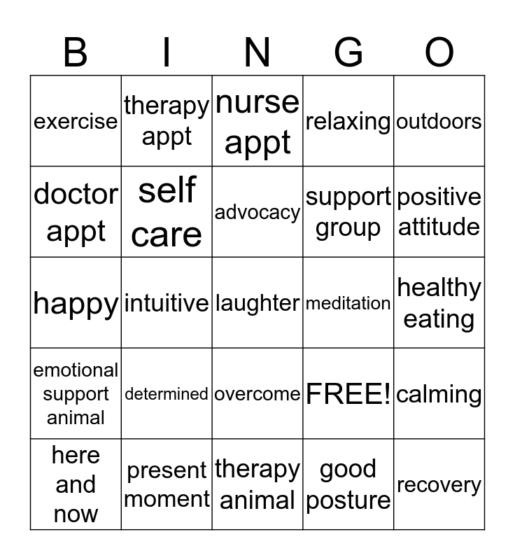 This bingo card has 27 words: FREE!, recovery, support group, therapy animal, doctor appt, nurse appt, therapy appt, emotional support animal, meditation, calming, happy, relaxing, here and now, present moment, positive attitude, recovery story, self care, advocacy, determined, exercise, healthy eating, good posture, intuitive, laughter, overcome, outdoors and out in the sun.