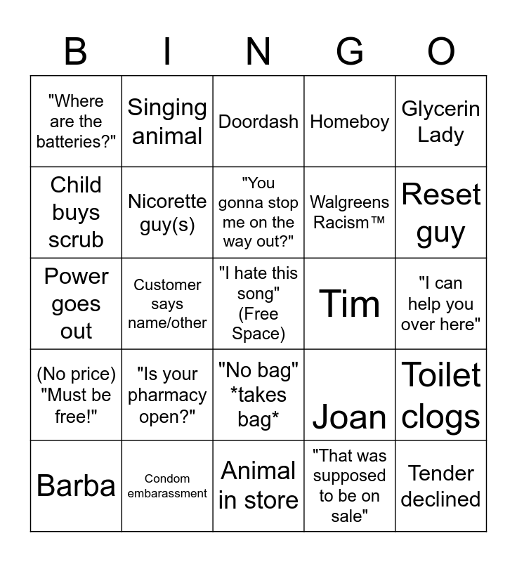 This bingo card has a free space and 27 words: Joan, Paula, Walgreens Racism™️, Animal in store, Child buys scrub, Doordash, Singing animal, (No price) "Must be free!", Tim, Toilet clogs, Power goes out, Homeboy, Barba, Condom embarassment, Reset guy, Middle school swarm, Nicorette guy(s), "You gonna stop me on the way out?", "Is your pharmacy open?", "Where are the batteries?", "I can help you over here", "That was supposed to be on sale", Customer says name/other, Tender declined, "No bag" *takes bag*, Glycerin Lady and Cop in store.