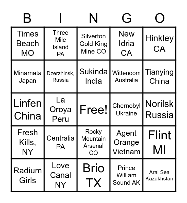 This bingo card has a free space and 24 words: Centralia PA, Love Canal NY, Sukinda India, Radium Girls, Hinkley CA, Times Beach MO, Minamata Japan, Three Mile Island PA, Chernobyl Ukraine, Rocky Mountain Arsenal CO, Wittenoom Australia, Linfen China, Agent Orange Vietnam, Flint MI, Dzerzhinsk, Russia, Prince William Sound AK, Norilsk Russia, Silverton Gold King Mine CO, Tianying China, La Oroya Peru, Aral Sea Kazakhstan, Fresh Kills, NY, New Idria CA and Brio TX.