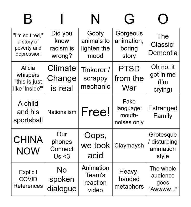 This bingo card has a free space and 24 words: Our phones Connect Us <3, No spoken dialogue, Tinkerer / scrappy mechanic, Explicit COVID References, The Classic: Dementia, "I'm so tired," a story of poverty and depression, Alicia whispers "this is just like 'Inside'", Did you know racism is wrong?, Fake language: mouth-noises only, Oops, we took acid, PTSD from the War, A child and his sportsball, Claymaysh, Grotesque / disturbing animation style, Climate Change is real, Heavy-handed metaphors, Estranged Family, Goofy animals to lighten the mood, Oh no, it got in me (I'm crying), Nationalism, The whole audience goes "Awwww...", CHINA NOW, Gorgeous animation, boring story and Animation Team's reaction video.