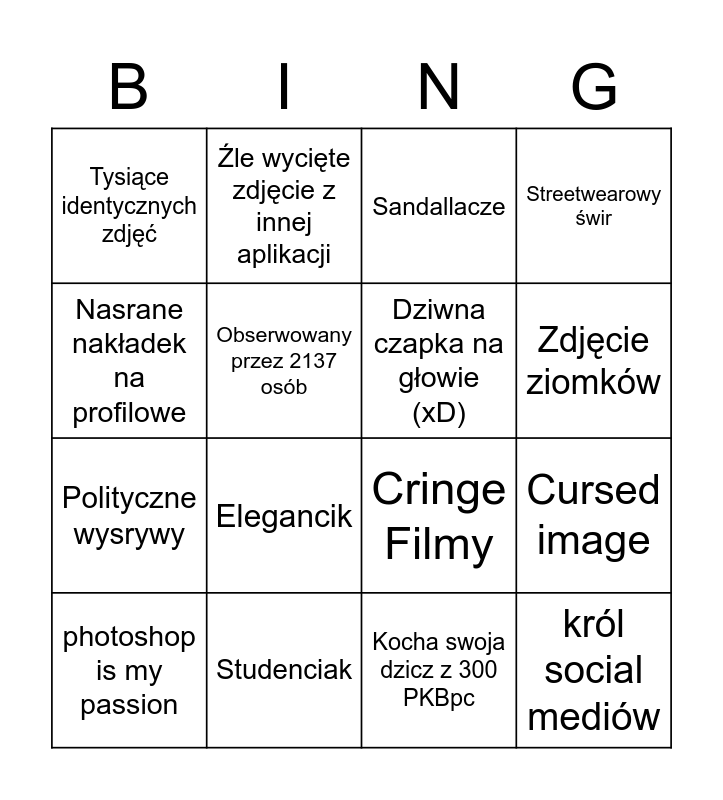 This bingo card has 25 words: Dziwny cytat, Dużo Emoji, Zdjęcie ziomków, Klubowa koszulka, Nasrane nakładek na profilowe, Tysiące identycznych zdjęć, Obserwowany przez 2137 osób, Źle wycięte zdjęcie z innej aplikacji, Studenciak, Rozpikselowane zdjęcie w tle, Polityczne wysrywy, Cringe Filmy, Zdjęcie z rodzinką, Messi Vs Ronaldo, Dziwna czapka na głowie (xD), Niewymawialne nazwisko, Kocha swoja dzicz z 300 PKBpc, Sandallacze, Elegancik, Cursed image, photoshop is my passion, cool okularki, król social mediów, Streetwearowy świr and Krajobraz jak po wojnie.