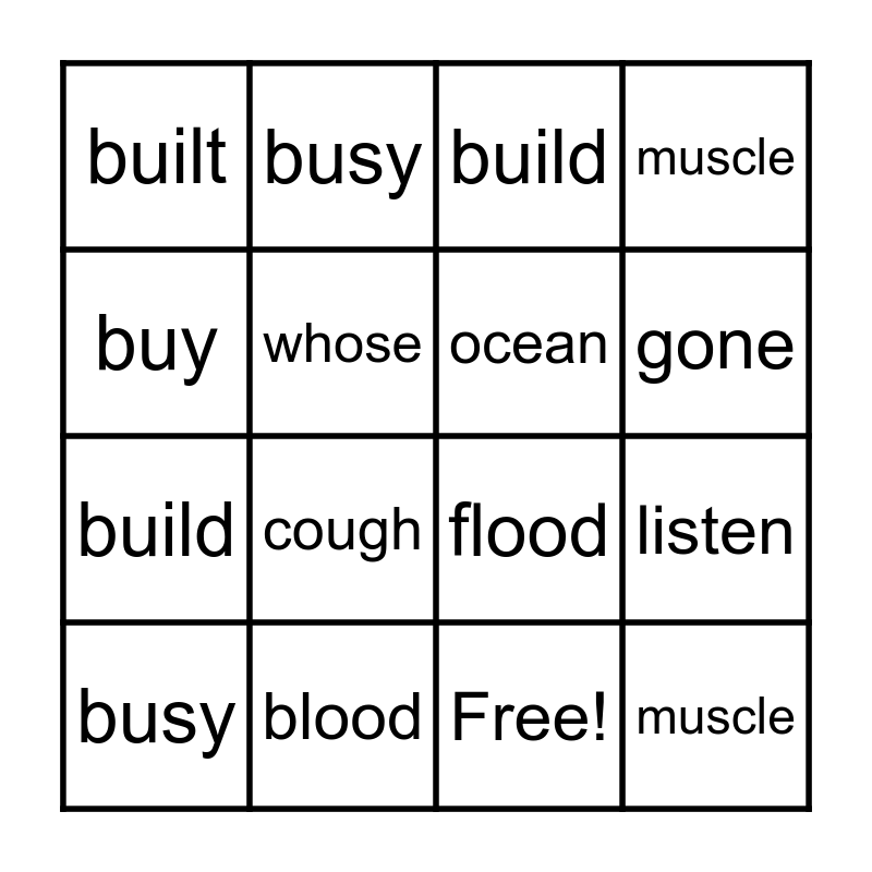 This bingo card has 17 words: Free!, busy, build, built, cough, muscle, listen, ocean, gone, whose, blood, flood, buy, busy, build, cough and muscle.