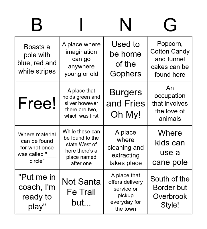 This bingo card has 16 words: Not Santa Fe Trail but..., Where kids can use a cane pole, Used to be home of the Gophers, Boasts a pole with blue, red and white stripes, Where material can be found for what once was called "___ circle", A place where imagination can go anywhere young or old, A place where cleaning and extracting takes place, A place that offers delivery service or pickup everyday for the town, Free!, A place that holds green and silver however there are two, which was first, "Put me in coach, I'm ready to play", Popcorn, Cotton Candy and funnel cakes can be found here, While these can be found to the state West of here there's a place named after one, An occupation that involves the love of animals, Burgers and Fries Oh My! and South of the Border but Overbrook Style!.