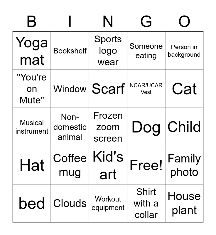This bingo card has 25 words: Coffee mug, Workout equipment, Scarf, bed, Person in background, Yoga mat, "You're on Mute", Bookshelf, Dog, Kid's art, NCAR/UCAR Vest, Musical instrument, Free!, Family photo, Window, House plant, Child, Sports logo wear, Cat, Non-domestic animal, Frozen zoom screen, Clouds, Hat, Someone eating and Shirt with a collar.