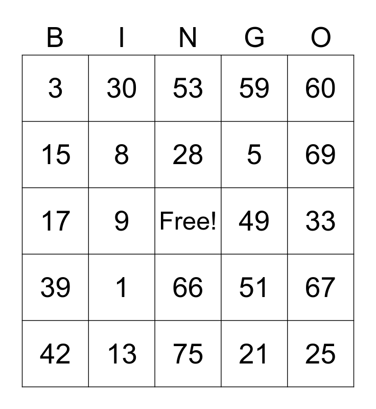 This bingo card has a free space and 24 words: 1, 13, 28, 42, 60, 3, 15, 30, 49, 66, 5, 17, 51, 67, 8, 21, 33, 53, 69, 9, 25, 39, 59 and 75.