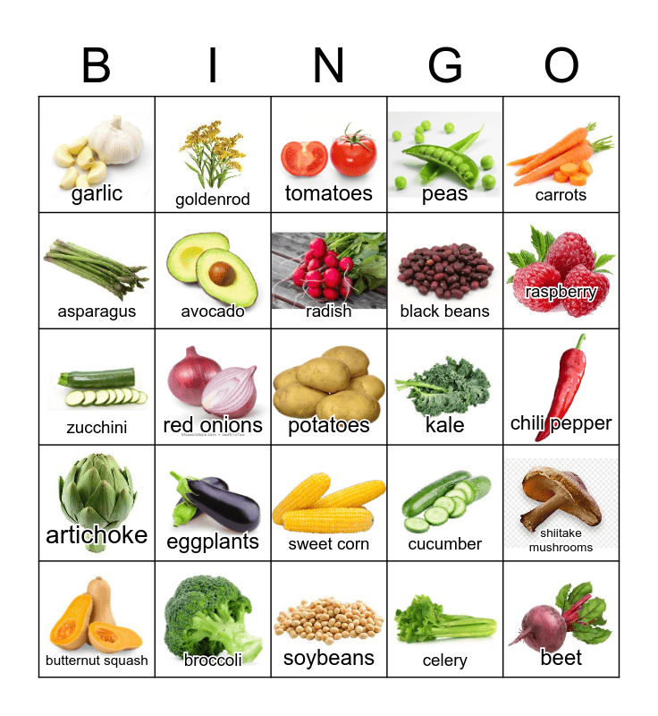 This bingo card has 39 images and 40 words: pumpkin, zucchini, bell peppers, avocado, broccoli, sweet corn, radish, cauliflower, carrots, artichoke, red onions, peas, potatoes, chili pepper, kale, eggplants, red cabbage, garlic, ginger, tomatoes, shiitake mushrooms, celery, black beans, asparagus, lettuce, green onion, spinach, yellow watermelon, beet, iceberg lettuce, sweet potatoes, butternut squash, kohlrabi, cucumber, raspberry, soybeans, bok choy, coneflower, goldenrod and pumpkin.