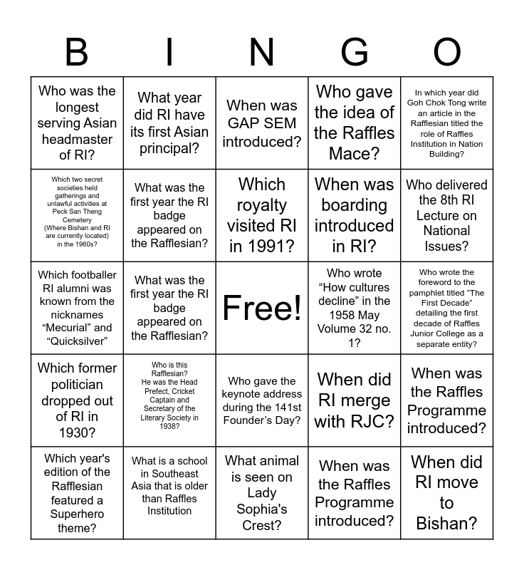 This bingo card has a free space and 24 words: Who is this Rafflesian? He was the Head Prefect, Cricket Captain and Secretary of the Literary Society in 1938?, What is a school in Southeast Asia that is older than Raffles Institution, Which royalty visited RI in 1991?, Which year's edition of the Rafflesian featured a Superhero theme?, In which year did Goh Chok Tong write an article in the Rafflesian titled the role of Raffles Institution in Nation Building?, Who was the longest serving Asian headmaster of RI?, Which two secret societies held gatherings and unlawful activities at Peck San Theng Cemetery (Where Bishan and RI are currently located) in the 1960s?, What year did RI have its first Asian principal?, Who wrote “How cultures decline” in the 1958 May Volume 32 no. 1?, Who gave the keynote address during the 141st Founder’s Day?, When was boarding introduced in RI?, Which footballer RI alumni was known from the nicknames “Mecurial” and “Quicksilver”, When did RI merge with RJC?, When was the Raffles Programme introduced?, What was the first year the RI badge appeared on the Rafflesian?, When was the Raffles Programme introduced?, Who wrote the foreword to the pamphlet titled “The First Decade” detailing the first decade of Raffles Junior College as a separate entity?, When was GAP SEM introduced?, Who delivered the 8th RI Lecture on National Issues?, What was the first year the RI badge appeared on the Rafflesian?, When did RI move to Bishan?, Which former politician dropped out of RI in 1930?, Who gave the idea of the Raffles Mace? and What animal is seen on Lady Sophia's Crest?.