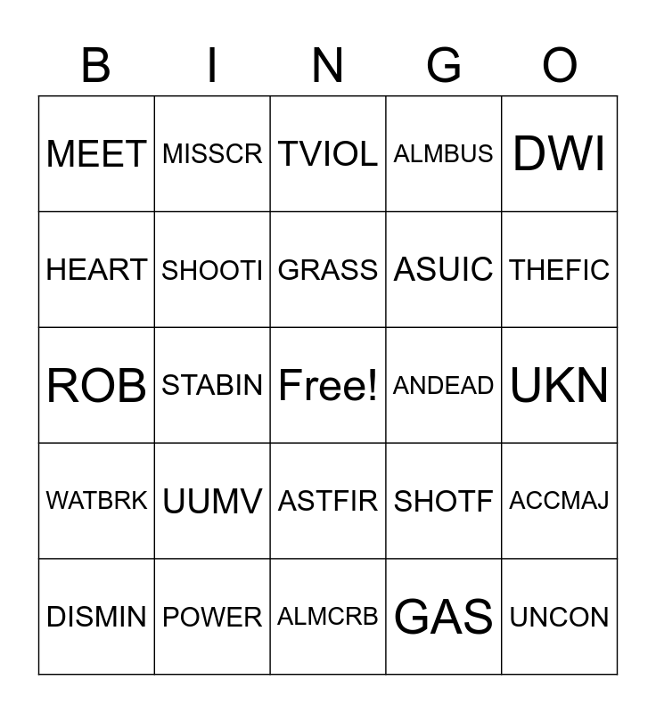 This bingo card has a free space and 24 words: UUMV, POWER, GRASS, DISMIN, DWI, MEET, HEART, MISSCR, ANDEAD, ASTFIR, ASUIC, ROB, SHOTF, ACCMAJ, SHOOTI, GAS, UKN, TVIOL, THEFIC, STABIN, UNCON, WATBRK, ALMBUS and ALMCRB.