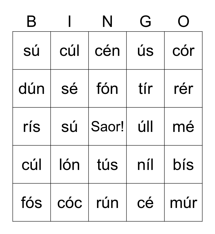 This bingo card has a free space and 24 words: lón, cóc, fón, fós, cór, sú, dún, cúl, úll, tús, tír, rís, níl, bís, sé, cé, mé, cén, rér, sú, múr, cúl, ús and rún.