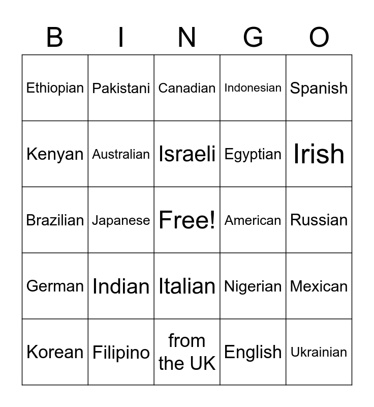 This bingo card has a free space and 29 words: Korean, Chinese, Japanese, Vietnamese, Ethiopian, Canadian, Australian, Indian, American, Filipino, Russian, Ukrainian, from the UK, English, Irish, French, Italian, German, Spanish, Brazilian, Nigerian, Turkish, Egyptian, Kenyan, Indonesian, Pakistani, Mexican, Israeli and South African.