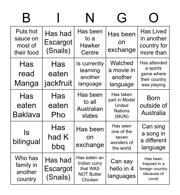 This bingo card has a free space and 29 words: Who has family in another country, Is currently wearing their traditional dress, Has eaten Pho, Has driven across international borders, Puts hot sauce on most of their food, Has been to a Hawker Centre, Has eaten jackfruit, Has had K bbq, Has taken part in Model United Nations (MUN), Has had Escargot (Snails), Born outside of Australia, Has been trapped in a foreign country because of covid, Has eaten an Indian curry that WAS NOT Butter Chicken, Can say hello in 4 languages, Has attended a sports game where their country was playing, Can speak three languages, Has been on exchange, Is bilingual, Has Lived in another country for more than, Has eaten Baklava, Has seen one of the seven wonders of the world, Has attended Wominjeka, Watched a movie in another language, Has read Manga, Has been on exchange, Has had Escargot (Snails), Can sing a song in a different language, Is currently learning another language and Who has family in another country.