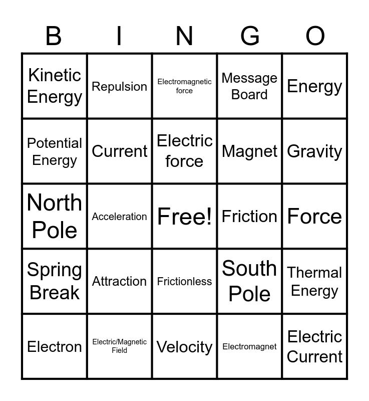 This bingo card has a free space and 24 words: Attraction, Electric/Magnetic Field, Electric force, Electron, Energy, Kinetic Energy, Potential Energy, Repulsion, Friction, Frictionless, Magnet, North Pole, South Pole, Thermal Energy, Current, Electromagnet, Force, Electromagnetic force, Gravity, Acceleration, Electric Current, Spring Break, Message Board and Velocity.
