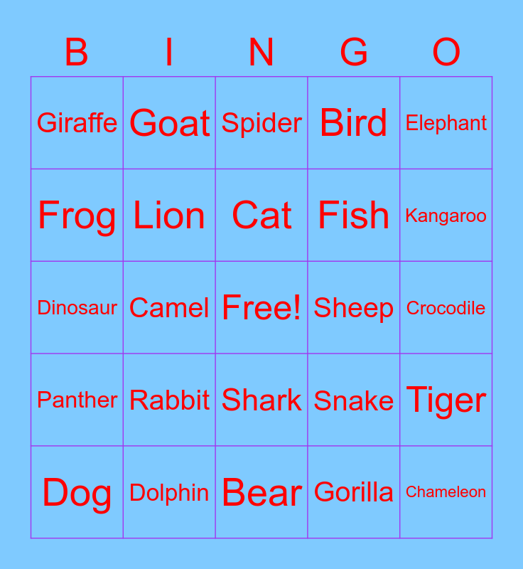 This bingo card has a free space and 24 words: Rabbit, Dolphin, Cat, Dog, Elephant, Giraffe, Frog, Goat, Sheep, Shark, Fish, Dinosaur, Snake, Tiger, Lion, Gorilla, Crocodile, Spider, Kangaroo, Camel, Chameleon, Panther, Bird and Bear.