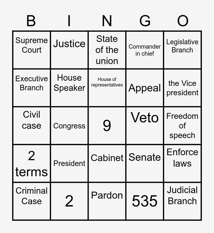 This bingo card has 25 words: President, Pardon, House of representatives, Criminal Case, Legislative Branch, Supreme Court, Executive Branch, Justice, Veto, Cabinet, Appeal, Civil case, Senate, Enforce laws, House Speaker, Judicial Branch, Freedom of speech, State of the union, the Vice president, Congress, 9, 2, 2 terms, Commander in chief and 535.