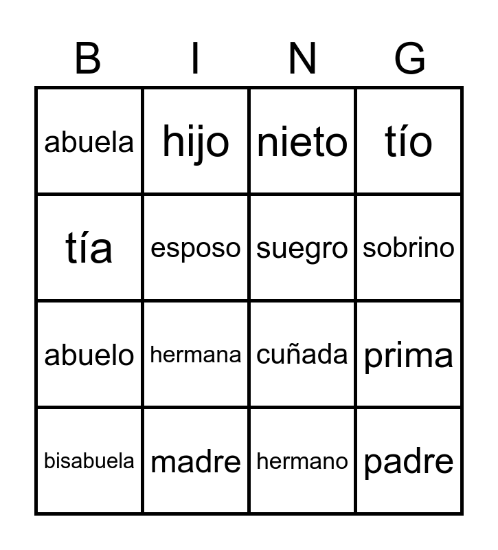 This bingo card has 16 words: madre, prima, nieto, abuela, abuelo, hijo, cuñada, hermano, tía, esposo, bisabuela, tío, hermana, sobrino, suegro and padre.