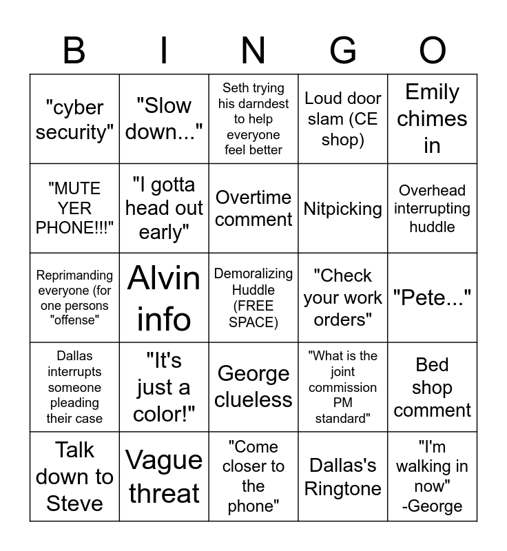 This bingo card has a free space and 24 words: "It's just a color!", Vague threat, Overtime comment, Talk down to Steve, Emily chimes in, "cyber security", "MUTE YER PHONE!!!", "Slow down...", "Check your work orders", George clueless, Nitpicking, Reprimanding everyone (for one persons "offense", "What is the joint commission PM standard", Bed shop comment, "I gotta head out early", Dallas's Ringtone, "Pete...", Seth trying his darndest to help everyone feel better, Overhead interrupting huddle, Alvin info, "I'm walking in now" -George, Dallas interrupts someone pleading their case, Loud door slam (CE shop) and "Come closer to the phone".