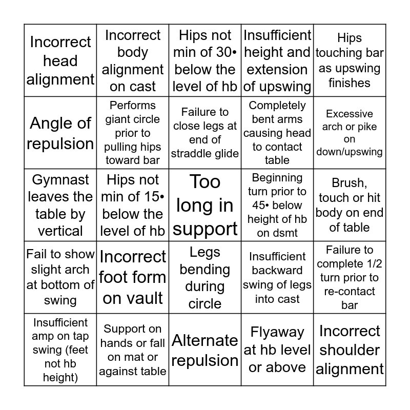 This bingo card has 25 words: Incorrect foot form on vault, Alternate repulsion, Failure to close legs at end of straddle glide, Insufficient amp on tap swing (feet not hb height), Hips touching bar as upswing finishes, Incorrect head alignment, Angle of repulsion, Incorrect body alignment on cast, Beginning turn prior to 45• below height of hb on dsmt, Legs bending during circle, Completely bent arms causing head to contact table, Gymnast leaves the table by vertical, Insufficient backward swing of legs into cast, Failure to complete 1/2 turn prior to re-contact bar, Performs giant circle prior to pulling hips toward bar, Incorrect shoulder alignment, Brush, touch or hit body on end of table, Hips not min of 30• below the level of hb, Excessive arch or pike on down/upswing, Hips not min of 15• below the level of hb, Too long in support, Support on hands or fall on mat or against table, Fail to show slight arch at bottom of swing, Insufficient height and extension of upswing and Flyaway at hb level or above.