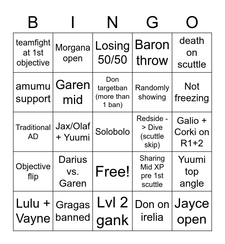 This bingo card has 26 words: Free!, Don on irelia, Don targetban (more than 1 ban), Gragas banned, death on scuttle, teamfight at 1st objective, amumu support, Morgana open, Galio + Corki on R1+2, Sharing Mid XP pre 1st scuttle, Randomly showing, Traditional AD, Yuumi top angle, Lulu + Vayne, Jax/Olaf + Yuumi, Comeback, Baron throw, Objective flip, Losing 50/50, Solobolo, Not freezing, Lvl 2 gank, Redside -> Dive (scuttle skip), Darius vs. Garen, Garen mid and Jayce open.